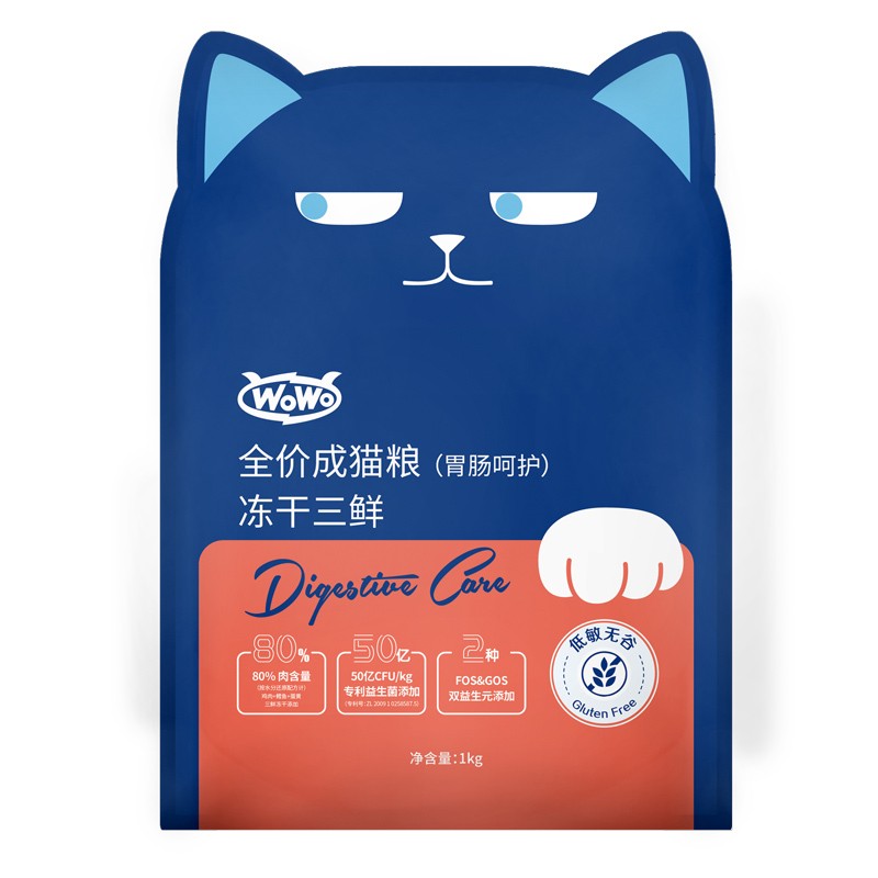 WOWO喔喔猫粮 冻干三鲜胃肠呵护全价成猫粮3种冻干4种肉专治挑嘴 【10斤装】1kg*5包