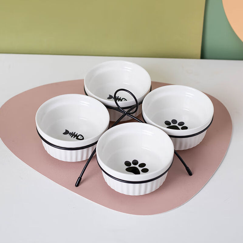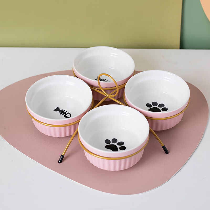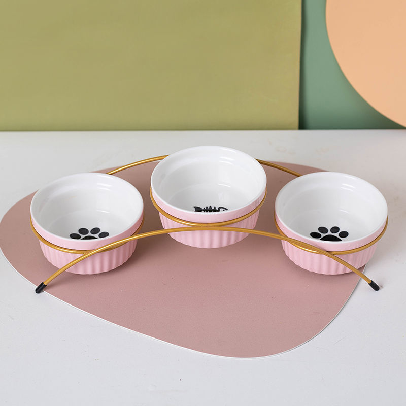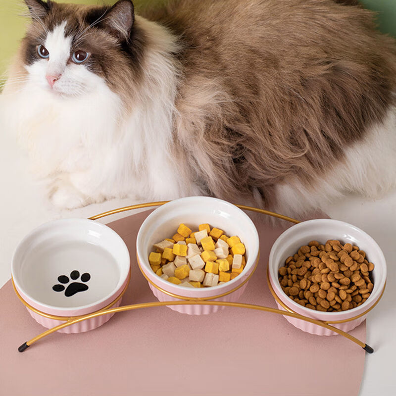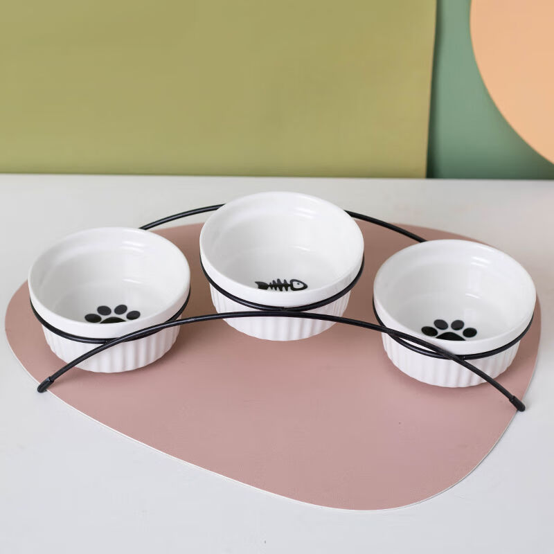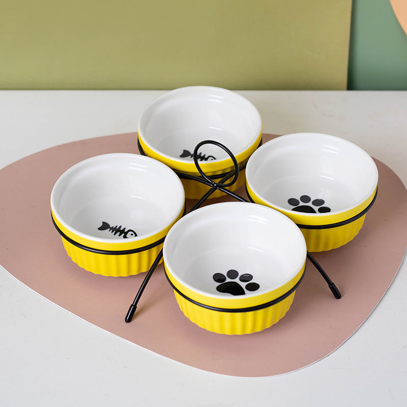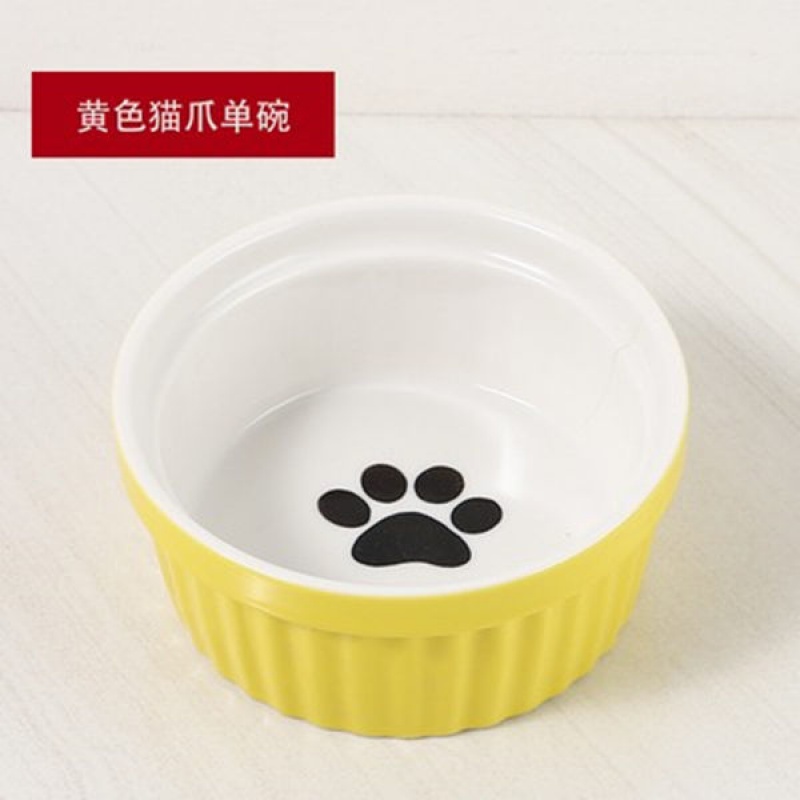 猫碗陶瓷猫咪猫粮三碗幼猫用食盆狗狗碗饭碗宠物饮水粮碗保护颈椎 单黄色爪印碗 猫咪和中小型犬通用-婴用陶瓷