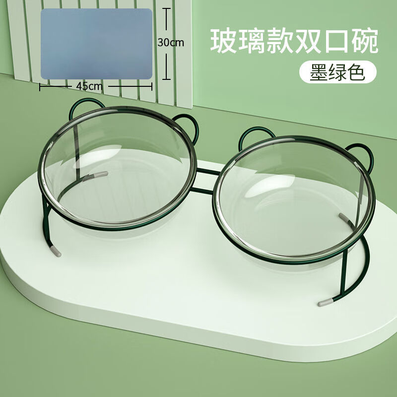宠物猫碗双碗保护颈椎狗碗猫盆幼猫防打翻宠物玻璃碗猫粮碗猫食盆 玻璃双碗 墨绿色支架 PVC餐垫 稳固安全材质-破损当日补发