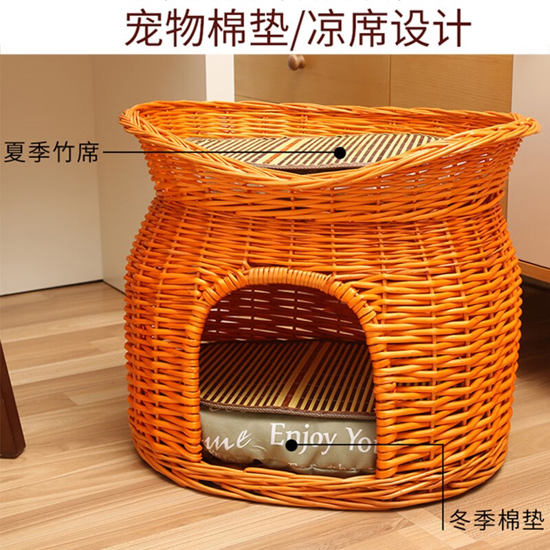 RUNPET双层藤编猫窝杞柳编织可拆洗猫屋别墅睡眠猫笼幼犬窝四季通用凉席 红棕窝 2个垫子2个凉席 XL-长60宽45高48厘米20斤以下