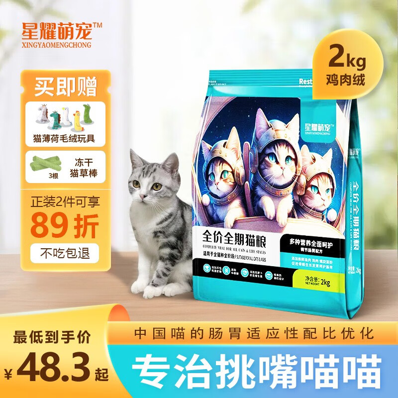 星耀萌宠全价猫粮幼猫成猫猫粮 冻干鸡肉绒易吸收 调理肠胃增肥发腮天然粮 2kg体验装