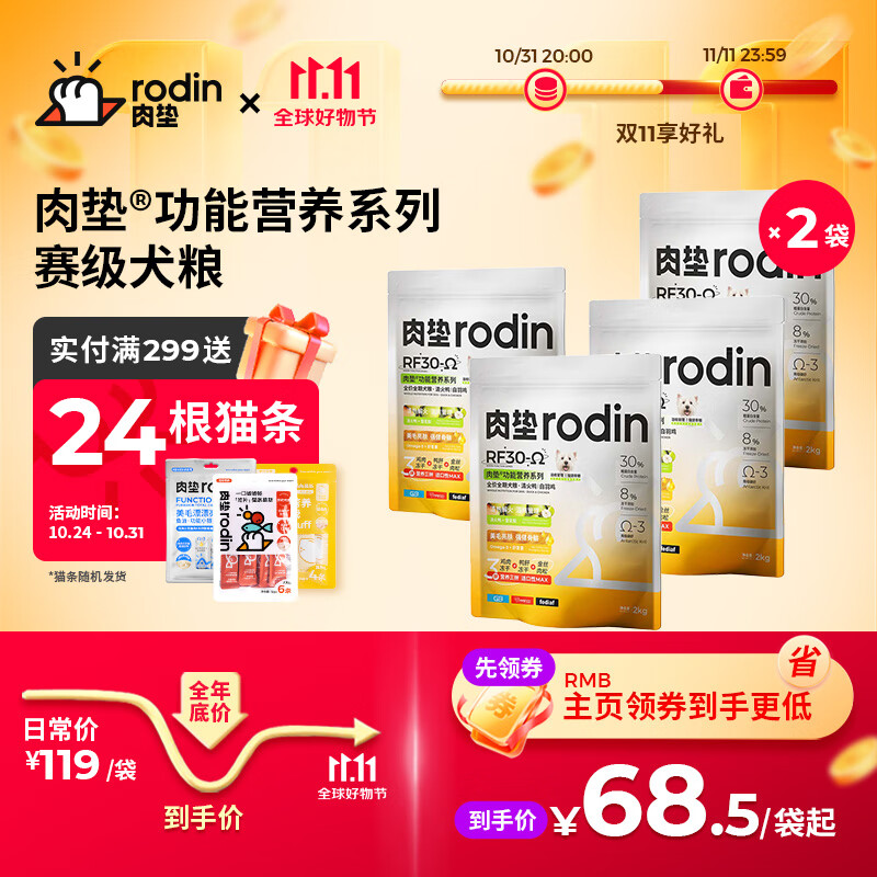肉垫RodinRF30-Ω功能营养系列全价全期犬粮 清火鸭 白羽鸡 2kg 【预售】犬粮清火鸭 白羽鸡4袋 2kg