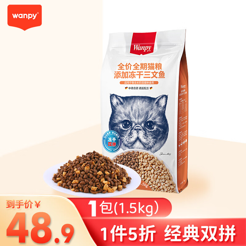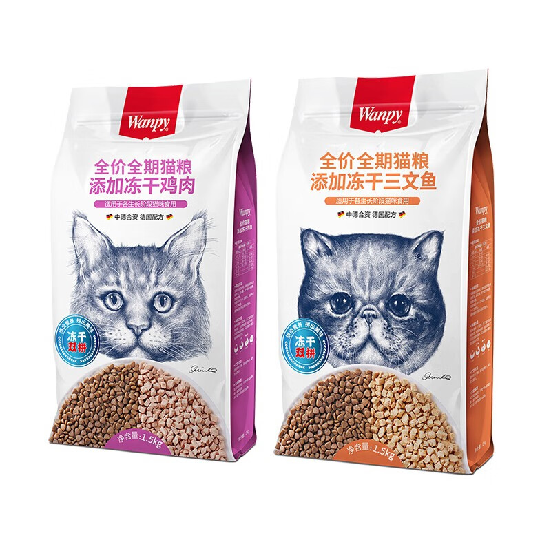 顽皮wanpy猫粮鸡肉味全价猫粮居家宠物主粮幼猫成猫布偶英短美短猫粮专用营养发腮低温烘焙粮猫咪食品 双拼冻干三文鱼猫粮1.5kg