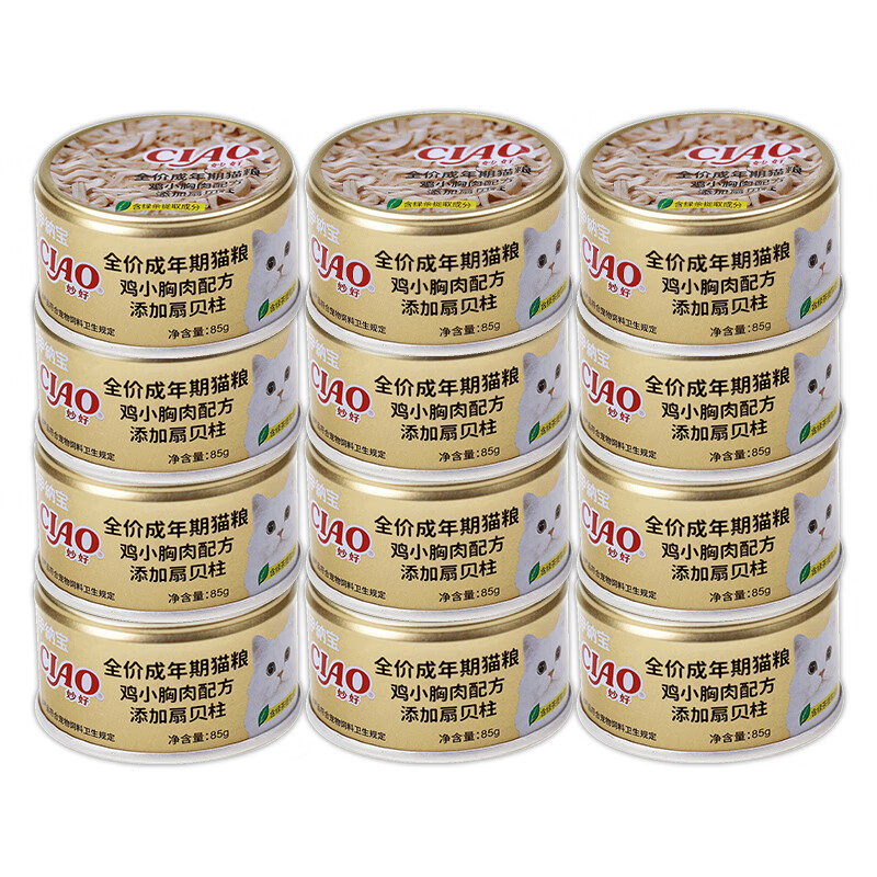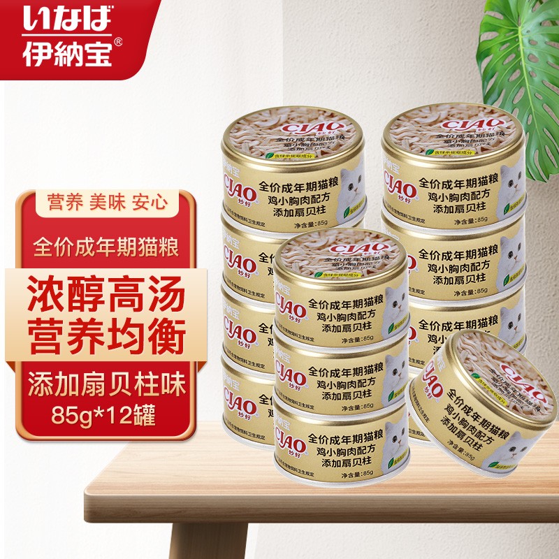伊纳宝妙好猫罐头 全价成年期猫粮 多种口味猫湿粮汤汁罐 添加扇贝柱味85g*12罐