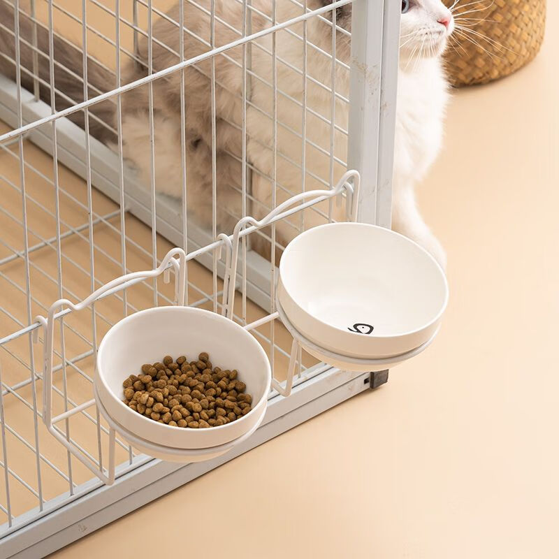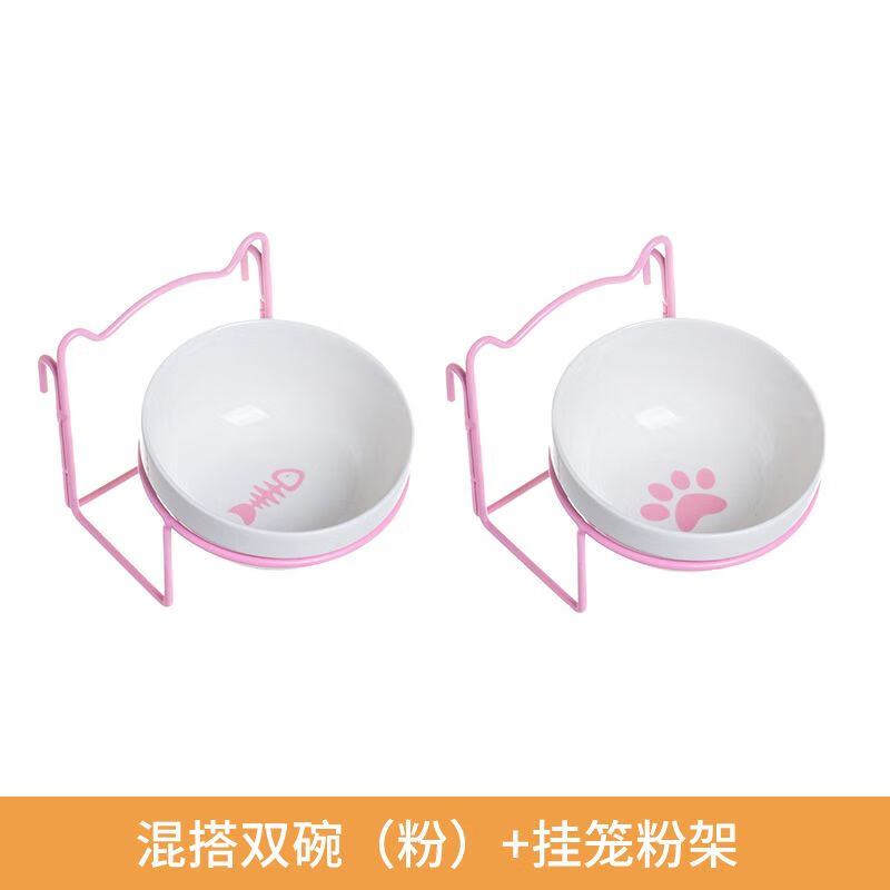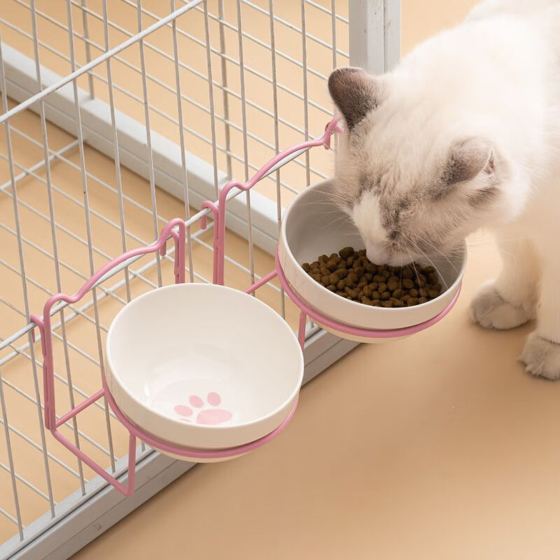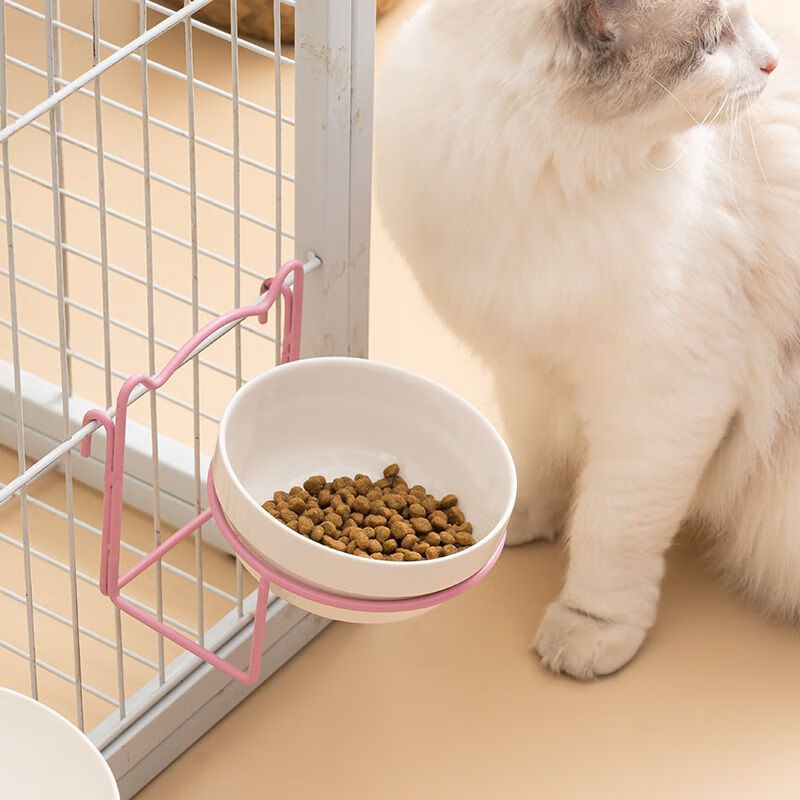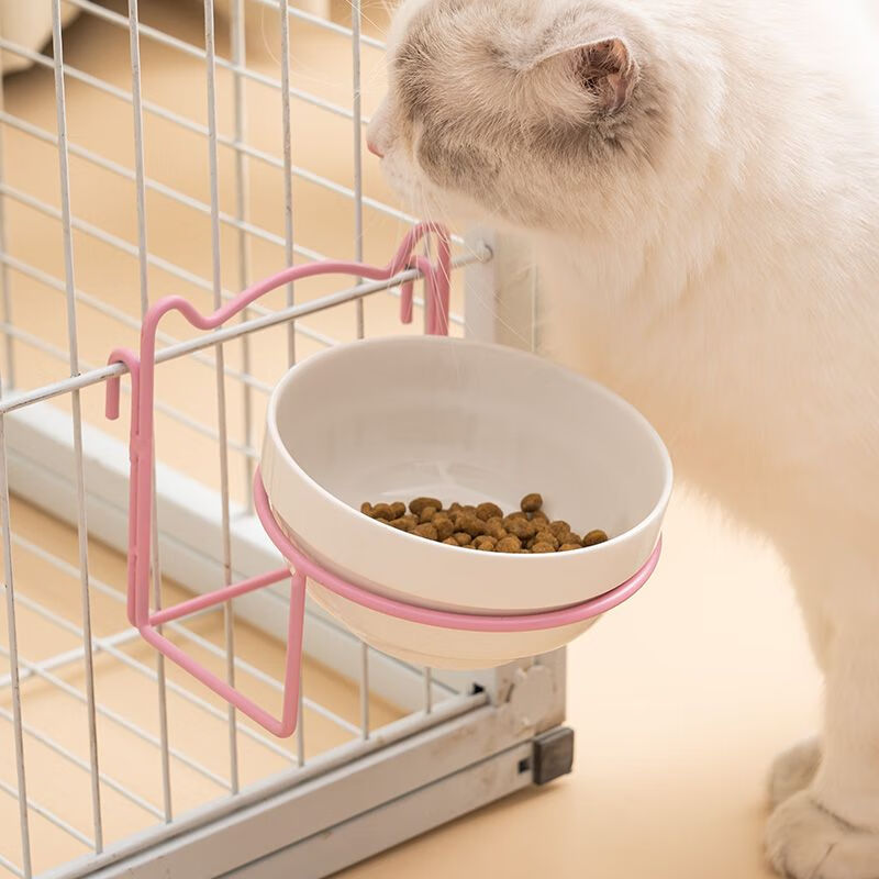 JHHUIYA挂笼猫碗斜口陶瓷防打翻猫咪食盆悬挂式狗狗喝水碗固定狗盆宠物碗 [挂笼碗]粉色双挂架双碗