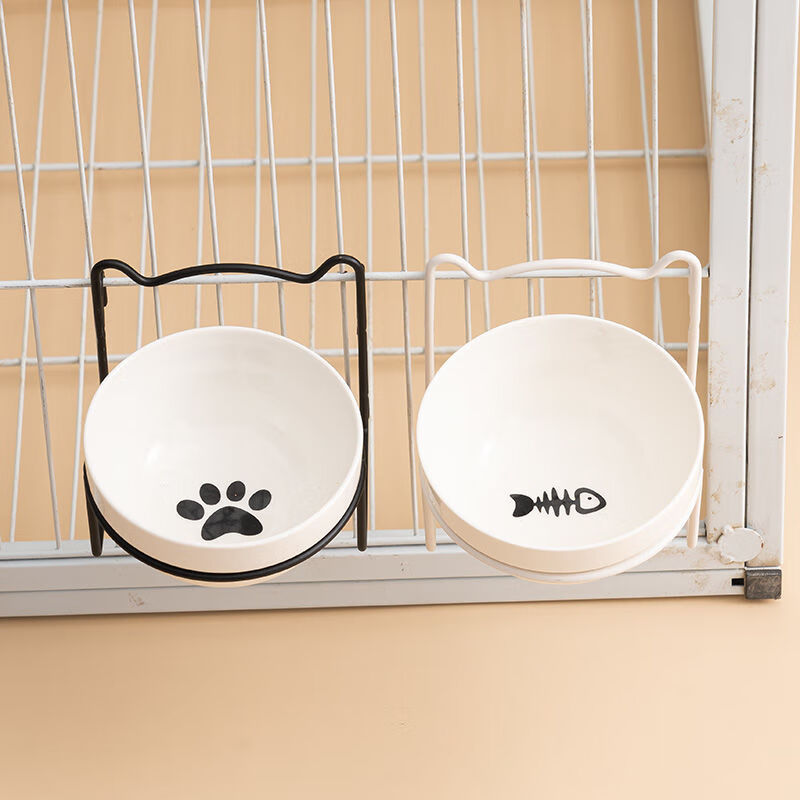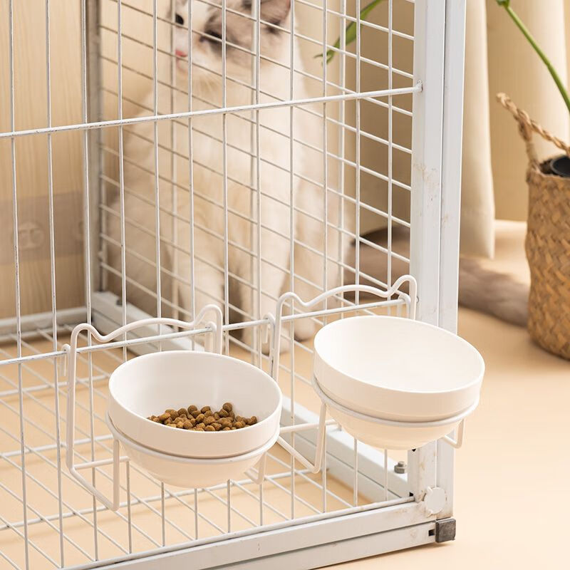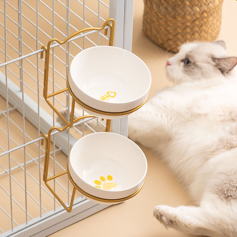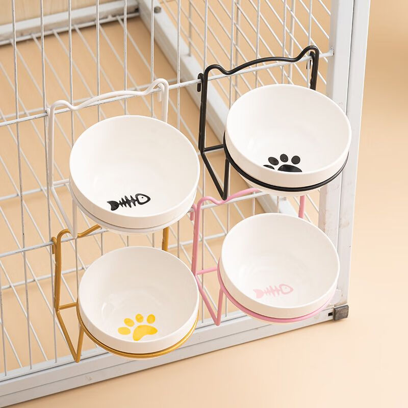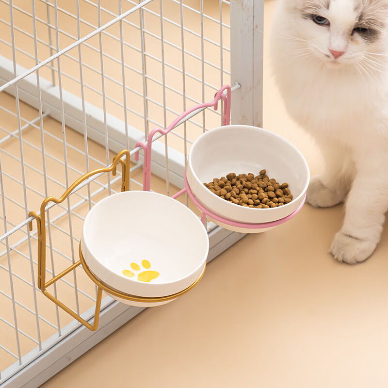 JHHUIYA挂笼猫碗斜口陶瓷防打翻猫咪食盆悬挂式狗狗喝水碗固定狗盆宠物碗 [挂笼碗]粉色双挂架双碗