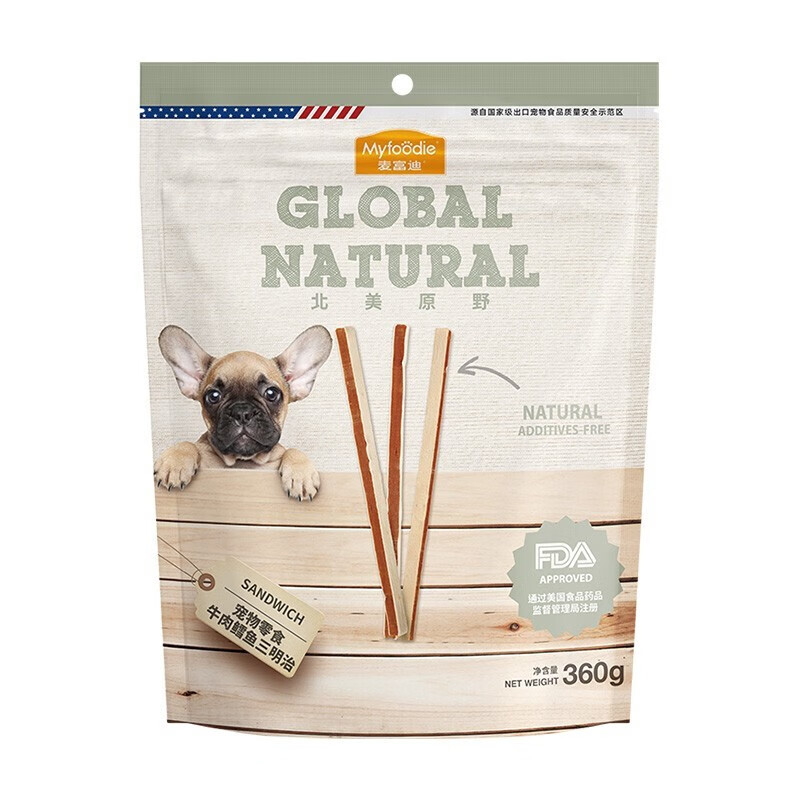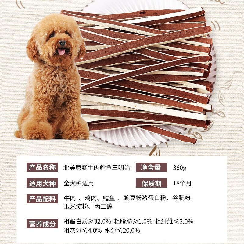 麦富迪(Myfoodie)狗狗零食北美原野系列磨牙解馋鸡鸭肉干比熊泰迪宠物训练奖励360g 牛肉鳕鱼三明治360g