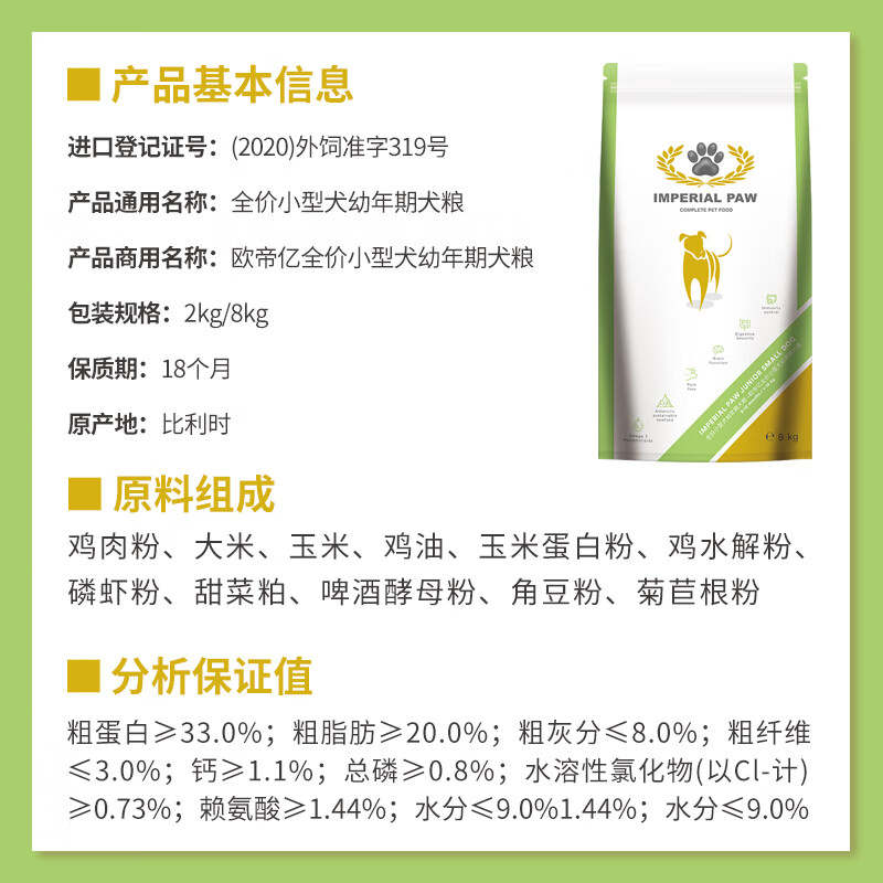 欧帝亿(IMPERIAL PAW)小型犬幼犬狗粮 全价幼年期犬粮 8kg 贵宾泰迪比熊博美雪纳瑞