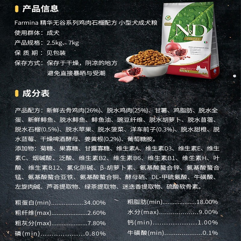 意大利原装进口 Farmina法米娜狗粮 成犬幼犬鸡肉鲱鱼无谷狗粮 小型成犬鸡肉石榴2.5kg