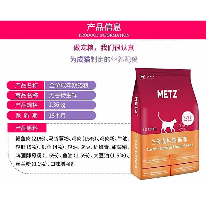 玫斯 无谷生鲜系列全价猫粮 无谷配方 45%冻鲜肉 宠物猫主粮 成年期猫粮1.36kg