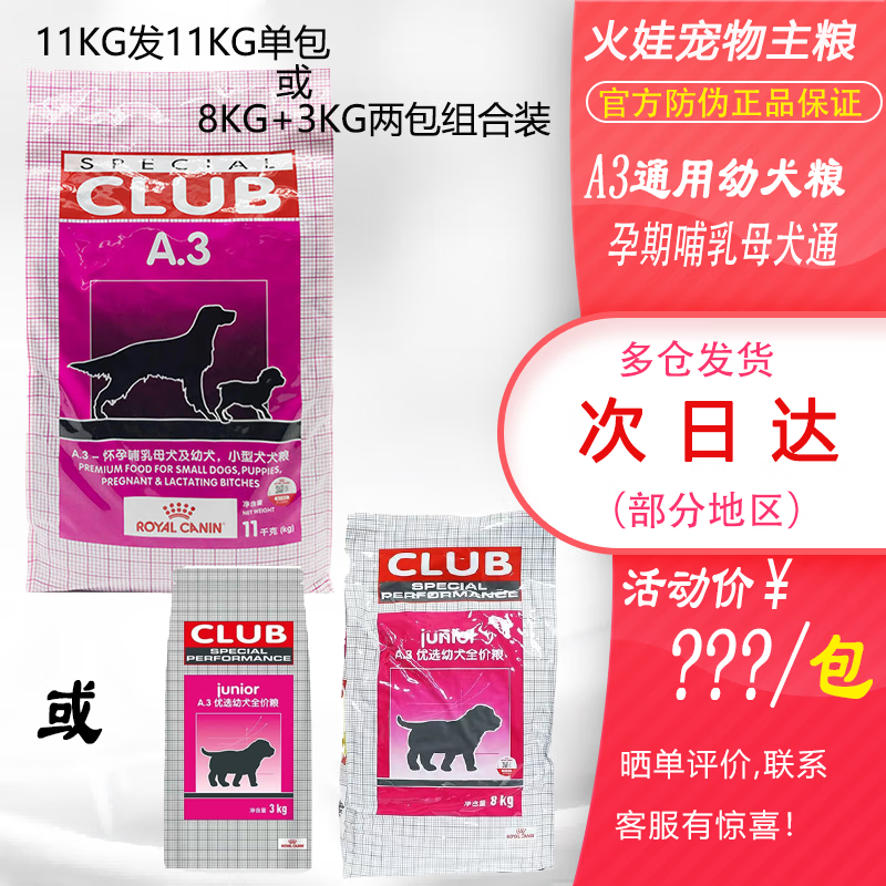 皇家狗粮A3幼犬狗粮 全犬种通用粮2-12月龄犬怀孕及哺乳期母犬 发单包11kg或8kg 3kg两包组合装 A3幼犬粮日期新鲜送货上门