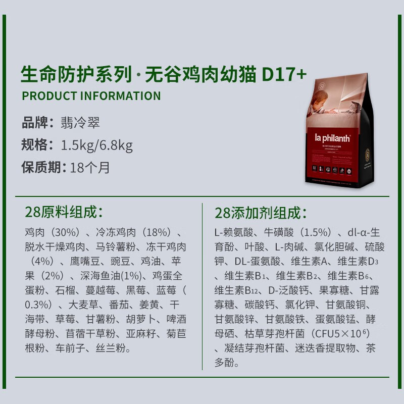 翡冷翠(LA PHILANTH)la philanth翡冷翠生命防护系列猫粮全猫龄冻干添加益生菌全价粮1 五谷鸡肉幼猫D17 1.5kg