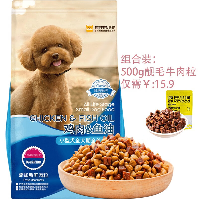 疯狂小狗 狗粮小型犬幼犬成犬泰迪贵宾博美比熊通用型肉粒双拼粮 【套装】经典款小蓝包 靓毛牛肉粒250g