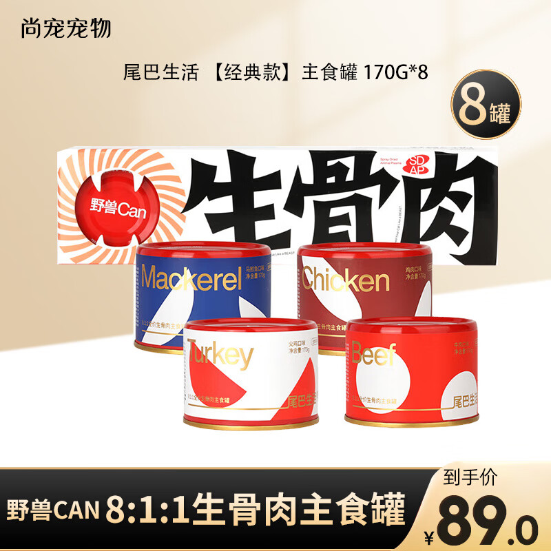 尾巴生活猫罐头 野兽CAN 811生骨肉主食猫罐头170g 猫咪幼猫成猫罐头湿粮 【经典款】170g*8罐