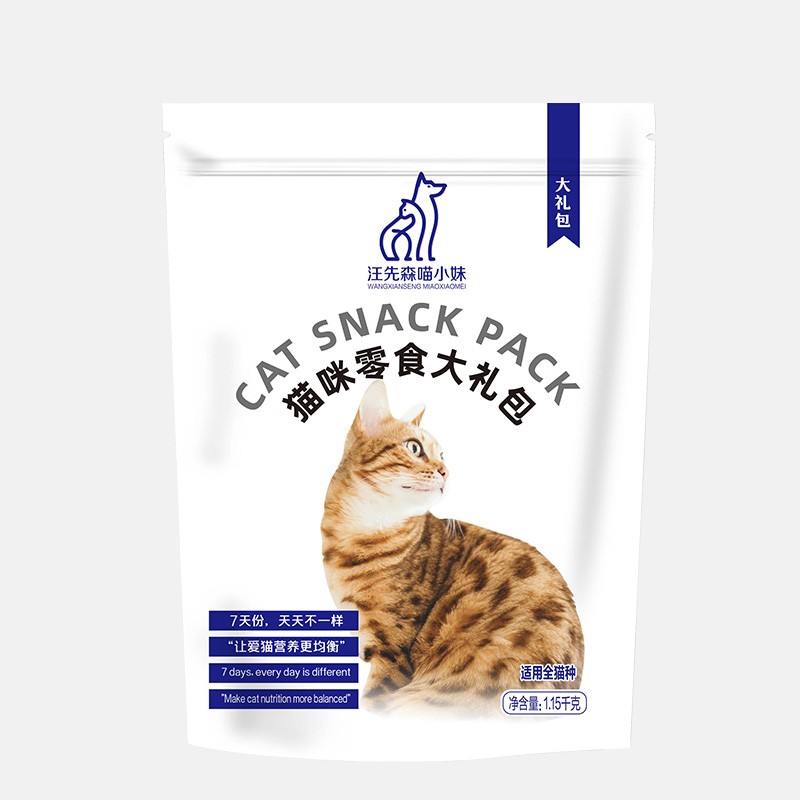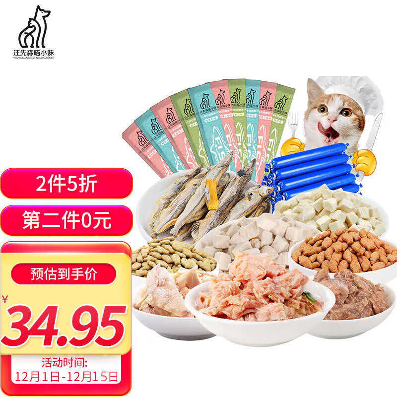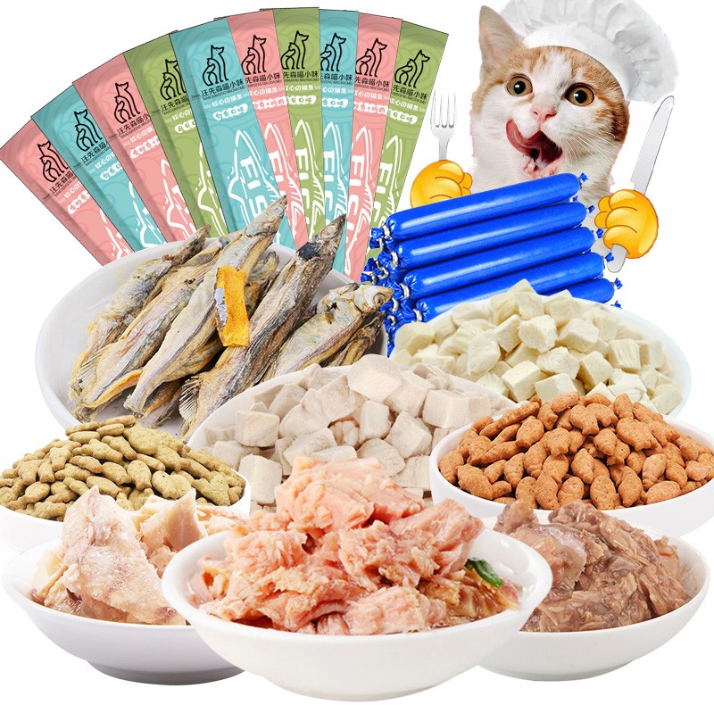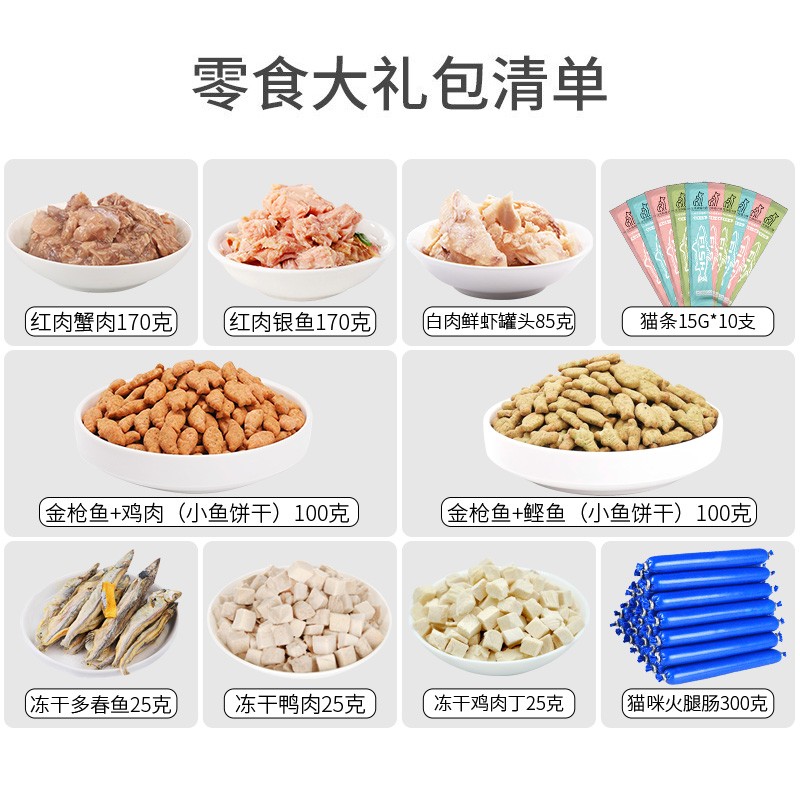 汪先森喵小妹 宠物猫咪幼猫成猫火腿肠鸡胸肉鸭肉冻干多春鱼肉虾肉罐头猫条10种零食大礼包1.15kg