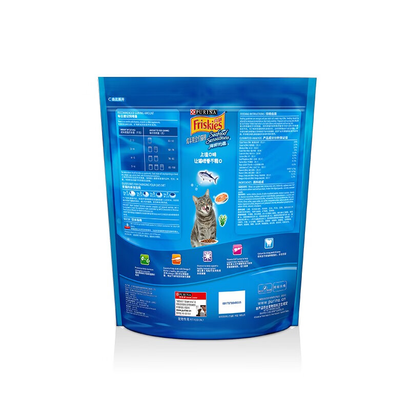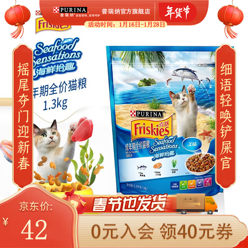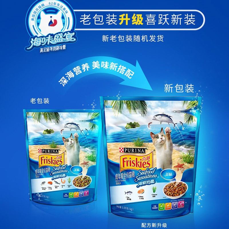 喜跃(Friskies)猫粮 成猫猫粮营养增肥发腮 蓝猫美短英短主粮 海鲜味 1.3kg 成猫粮(2段大于12个月)