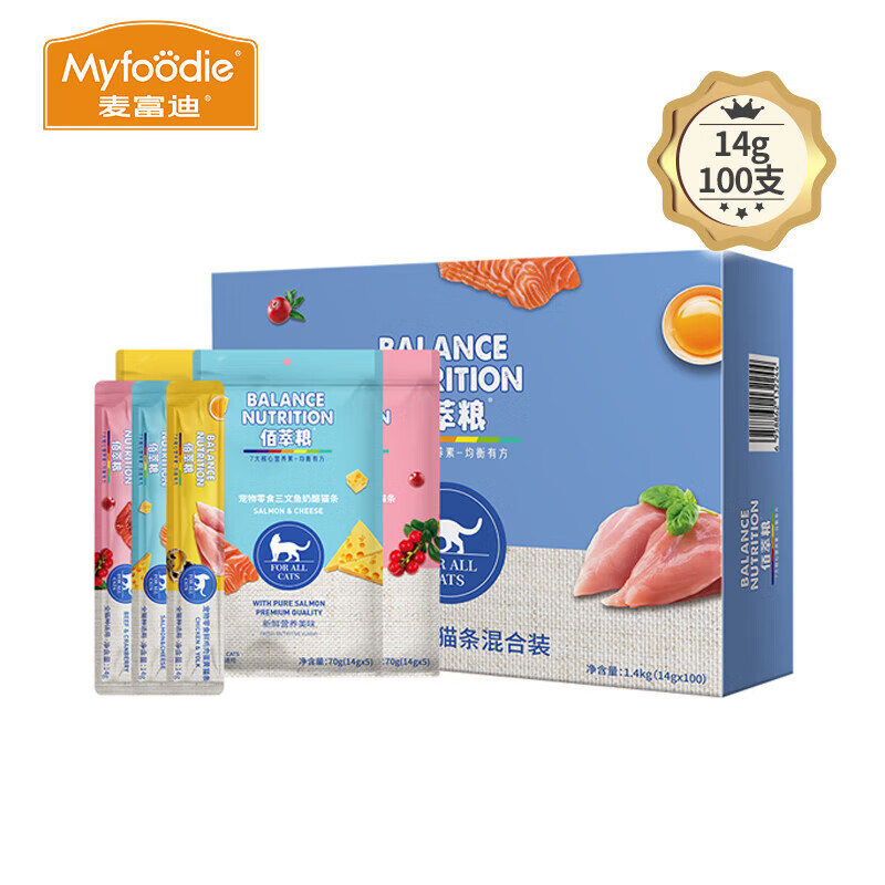 麦富迪(Myfoodie)佰萃猫条 猫零食全阶段补水妙鲜湿粮 幼猫混合装14g*100支