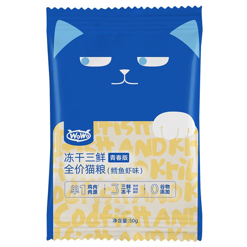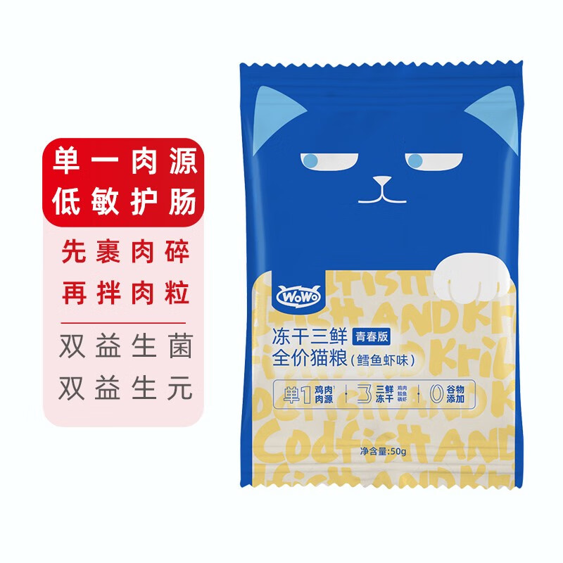 喔喔(WOWO)青春版冻干三鲜全价猫粮单一肉源无谷低敏高蛋白成猫幼猫通用主粮 鳕鱼虾味试吃装【50g】