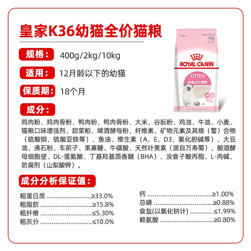 皇家(ROYAL CANIN) 猫粮 幼猫哺乳期孕猫猫粮K36 4-12月猫龄适用英短美短加菲猫猫粮 K36幼猫粮400g*5