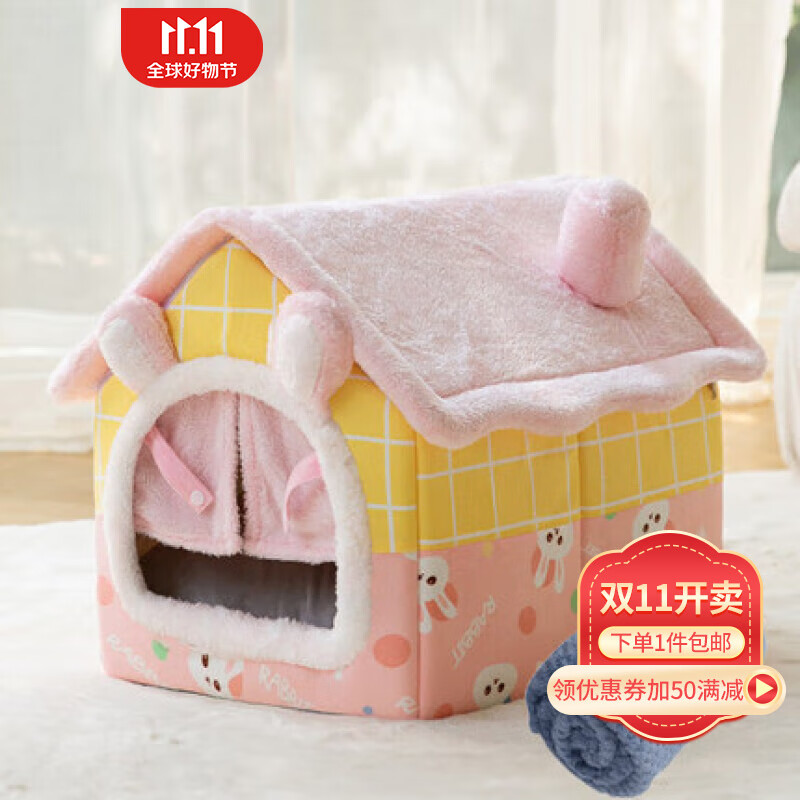 嬉皮狗猫窝四季通用房子型幼猫冬天保暖网红猫屋狗窝小型犬可拆洗宠物床 兔子门帘房子窝【搭配毛毯】 M-【适合15斤内猫咪】95%宠主选择猫犬通用