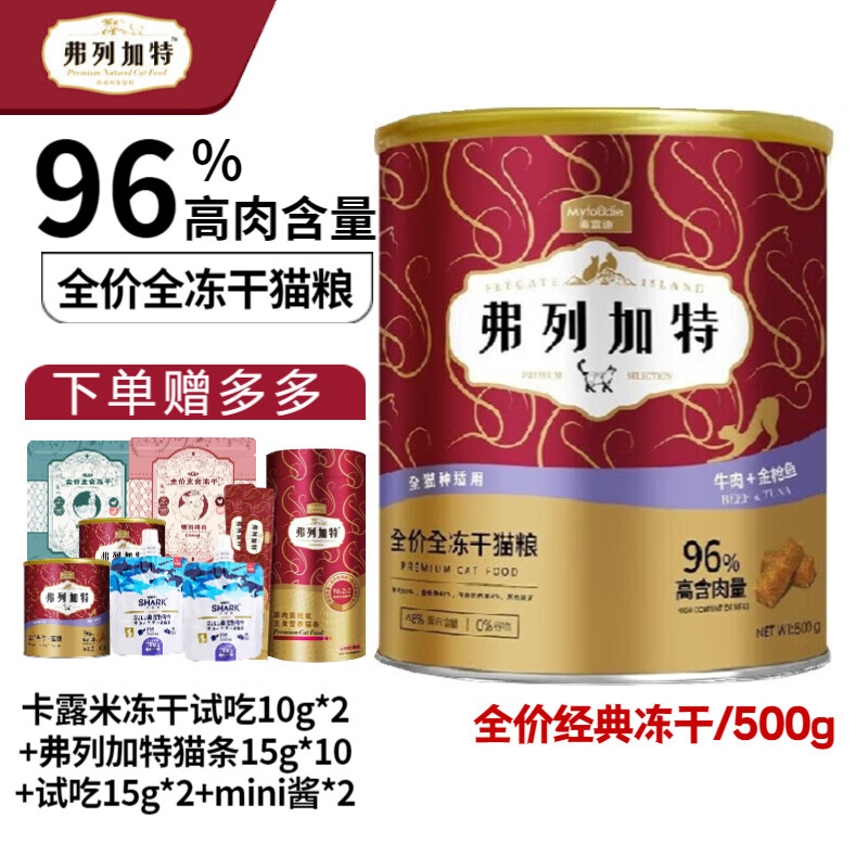 弗列加特(FREGATE ISLAND PREMIUM SELECTION)96%高肉含量冻干幼猫成猫粮主食冻干桶全价全冻干猫粮 牛肉 金枪鱼 500g【效期至24.6】