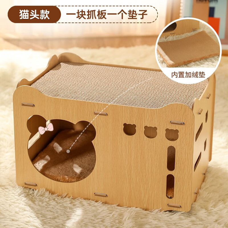 KimPets猫抓板 猫窝一体 耐磨不掉屑 猫抓窝耐抓猫咪蹭痒器 两层保暖 猫磨爪神器 【猫头款】加绒垫 一块抓板