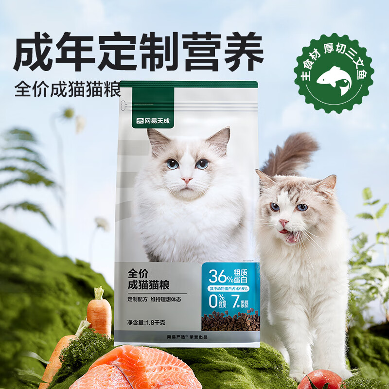 网易严选猫粮【轻囤装】全价成猫猫粮 无谷粮深海鱼肉宠物猫主粮 全阶段粮 ≥12个月|成猫粮 1.8kg*5袋