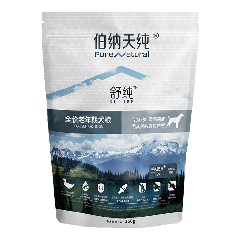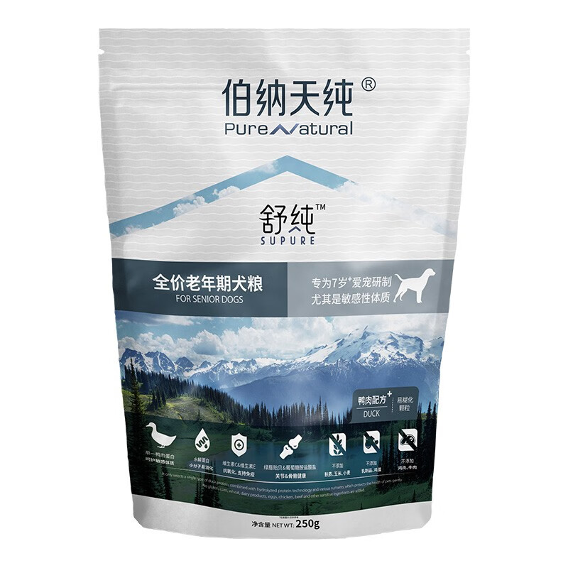 伯纳天纯舒纯鸭肉配方老年犬粮7岁以上全价低敏老年狗粮 舒纯老年狗粮250g