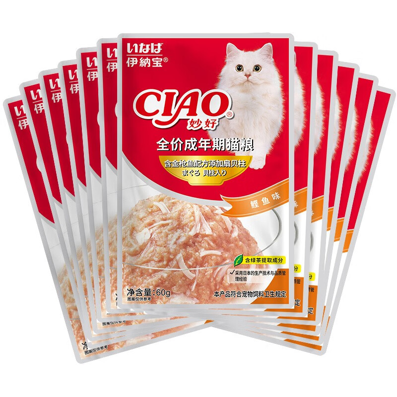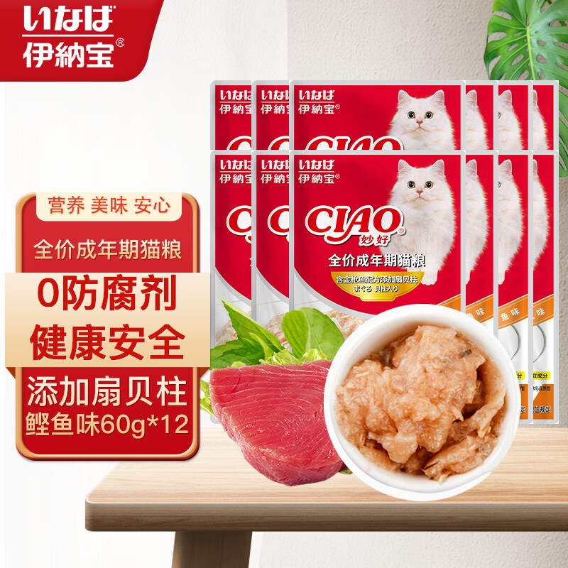 伊纳宝妙好妙鲜包 猫零食金枪鱼鸡肉等多口味 湿粮鲜封包 含金枪鱼配方添加扇贝柱鲣鱼味60g*12包