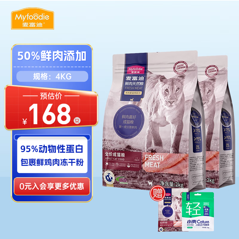 麦富迪(Myfoodie)猫粮 50%鲜肉成猫猫粮天然粮全价成猫粮 鸡肉 蔓越莓|鲜肉成猫粮2kg*2
