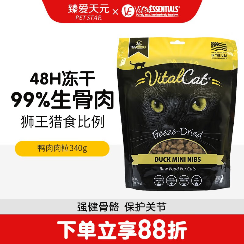 VITALESSENTIALS美国进口VE冻干生骨肉主食肉饼猫粮冻干粮 鸭肉肉粒340g 效期23/11/1