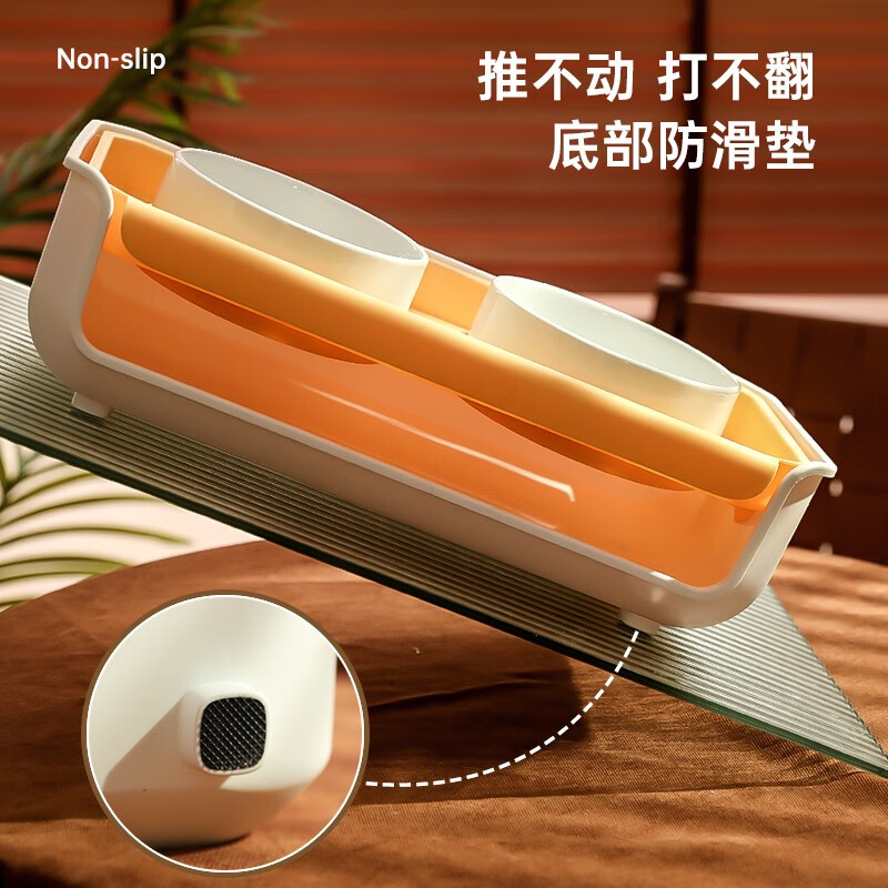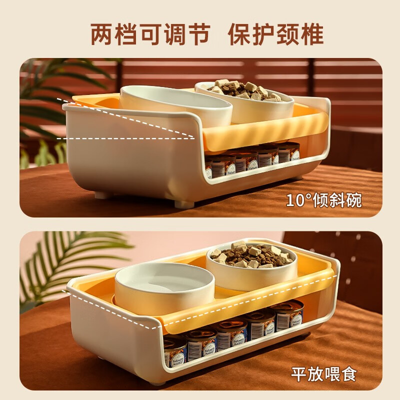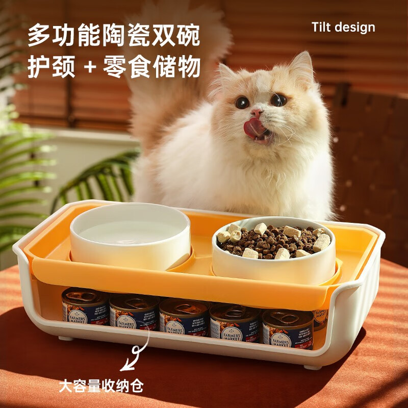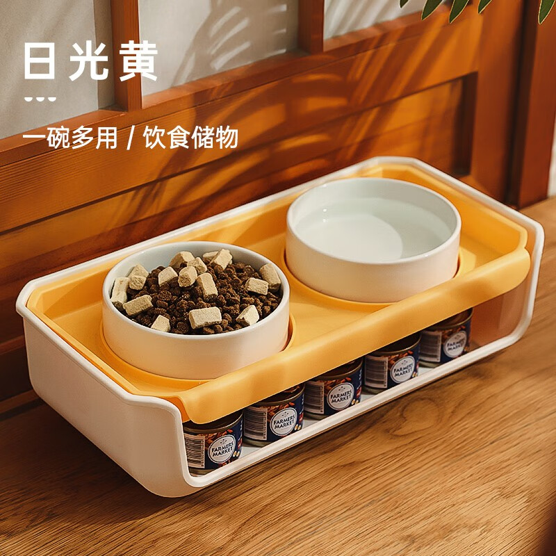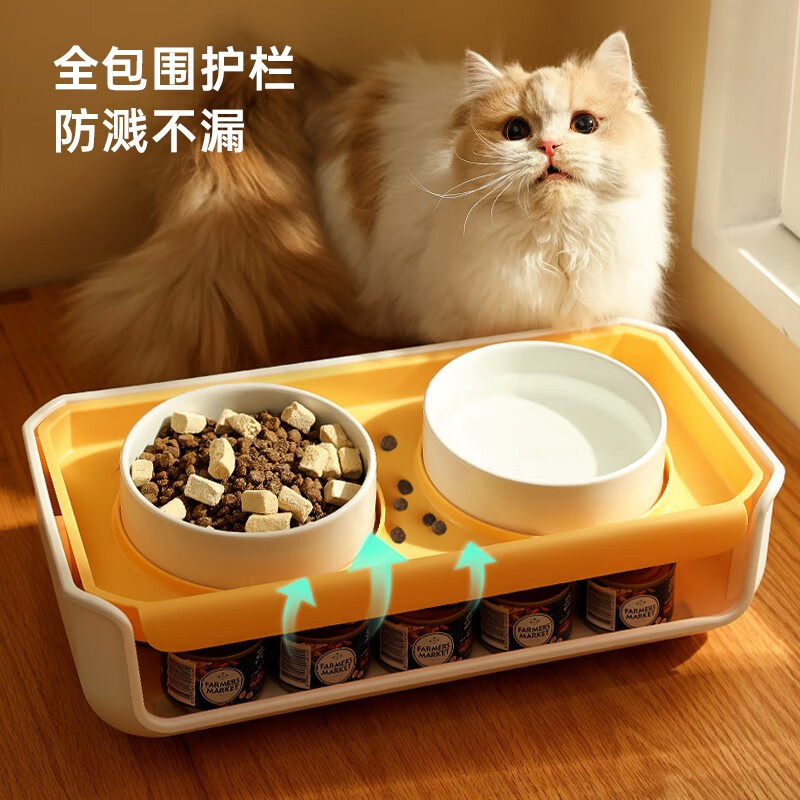 华元宠具(hoopet)德国品质 猫碗陶瓷双碗狗碗猫咪喝水猫粮狗食盆宠物保护颈椎防打 【防漏食碗架 陶瓷双碗】日光黄