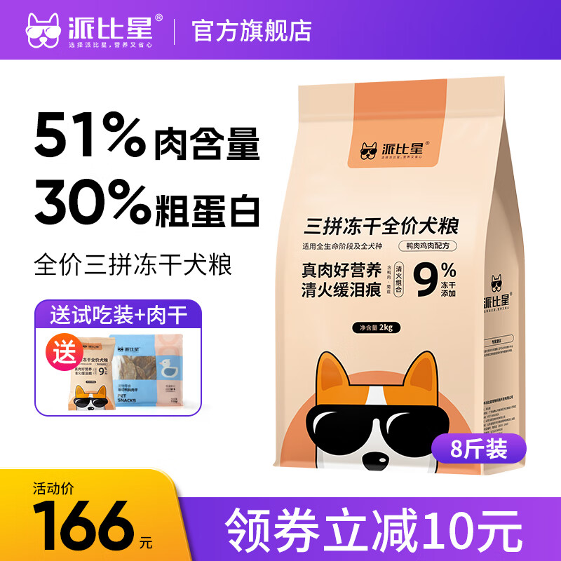 派比星狗粮幼犬成犬通用无谷鲜肉全价低敏鸭肉梨缓泪痕小中大型犬狗干粮 三拼冻干通用狗粮4kg