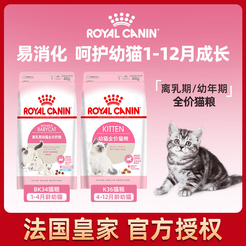 皇家(ROYAL CANIN)猫粮K36/BK34幼猫奶糕专用小猫母猫孕猫离乳期幼猫通用全价粮 【到手价46.9】K36幼猫粮400g*2 0g以实际含量为准