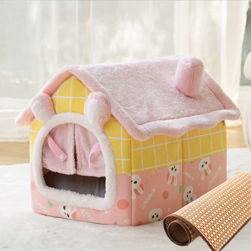 嬉皮狗狗窝房子型四季通用幼猫冬天保暖可拆洗猫窝狗屋冬季猫窝宠物床 可爱兔子门帘房子窝【搭配凉席】 L-【适合30斤内或多只猫咪】可拆喜