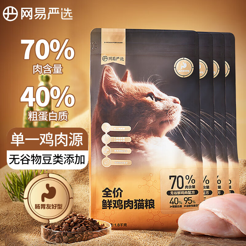网易严选 全价鲜鸡肉猫粮 单一鸡肉源益生菌高鲜肉低敏无谷成幼通用猫主粮 【鲜肉酶解技术】1.8kg*4袋
