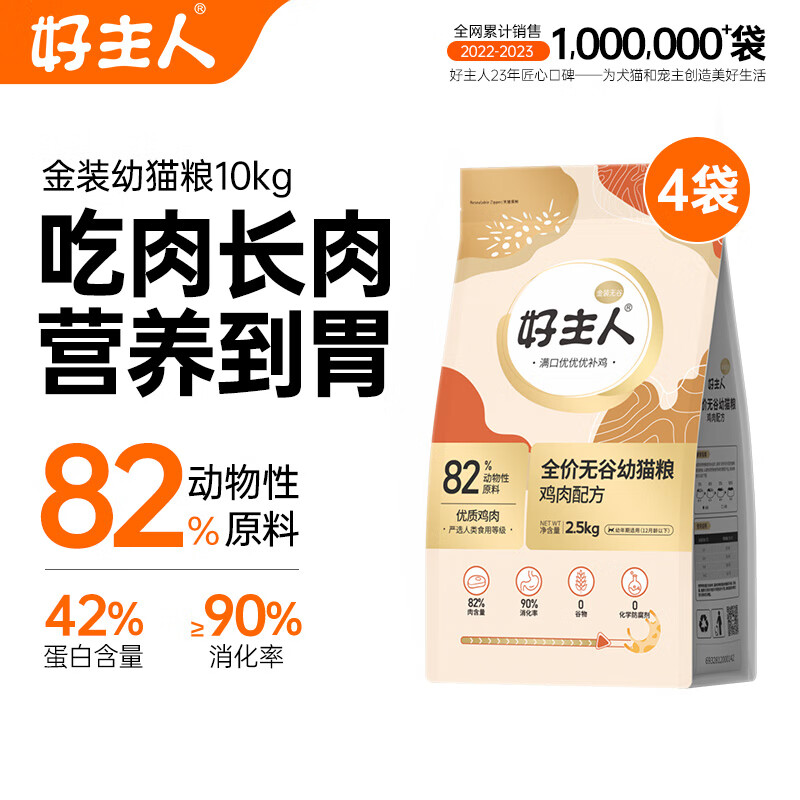 好主人金装猫粮2.0无谷 全价幼猫通用 82%含肉量 2.5kg*4(实发10kg)