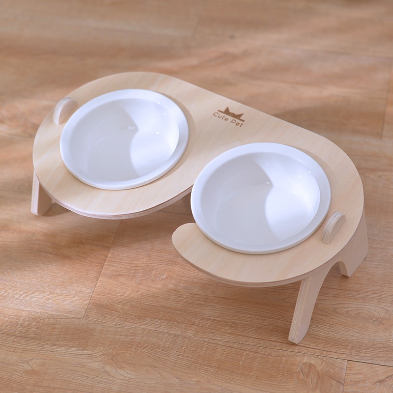 猫碗陶瓷斜口保护颈椎猫咪食盆狗饭碗猫粮宠物木架双碗水碗防打翻 (陶瓷碗)双碗 餐桌架 适用猫咪或小型犬