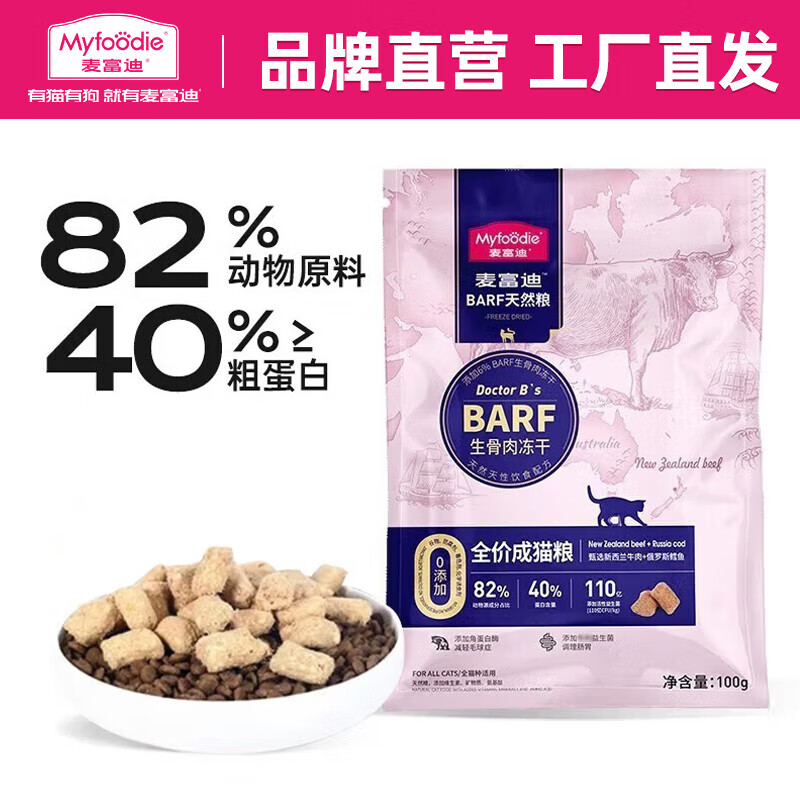 麦富迪 猫粮 barf生骨肉主食冻干双拼天然粮鲜肉营养无谷高肉高蛋白 成猫粮试吃包100g| 牛肉 鳕鱼