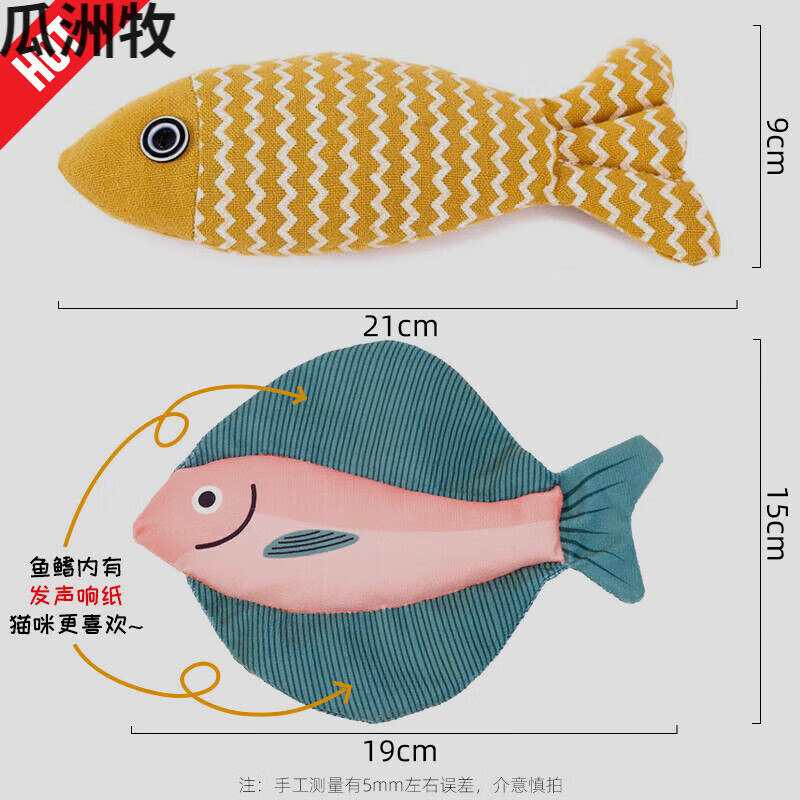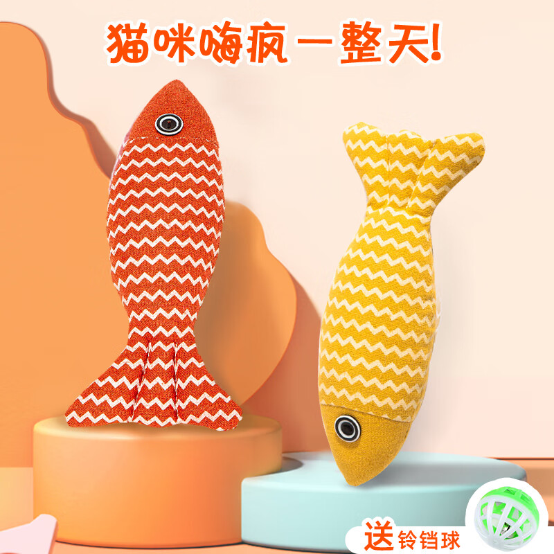 猫玩具自嗨猫薄荷布偶仿真鱼幼猫磨牙猫咪幼猫逗猫棒宠物猫猫用品 双鱼戏猫组黄色麻布鱼 发声小方鱼