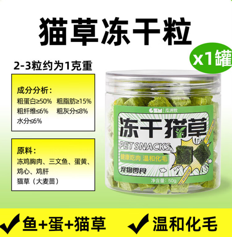 瓜洲牧猫草片粒冻干猫咪零食猫薄荷饼干磨牙棒懒人化毛球片增肥猫咪用品 冻干猫草粒50/g*1罐 000kg