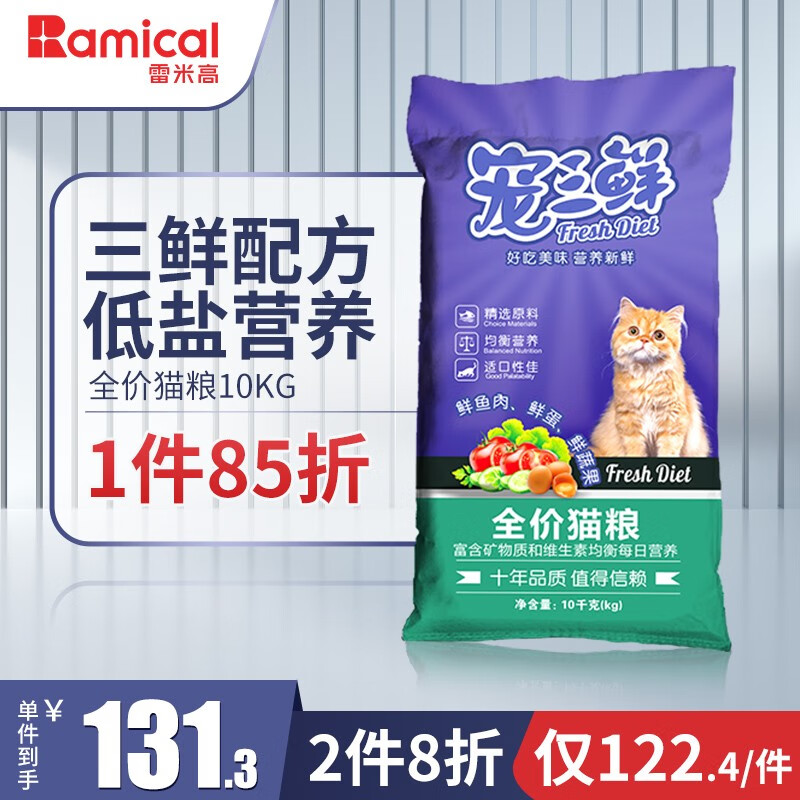 雷米高宠三鲜猫粮成猫幼猫干粮全价布偶蓝猫英短美短大包装猫食增肥发腮大袋全阶段 成幼猫通用型猫粮20斤装