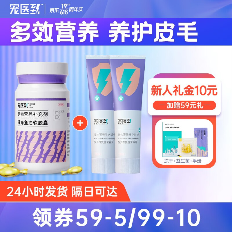 【七仓直发】宠医到 宠物鱼油99.9%纯度【含DHAΩ-3卵磷脂】狗狗猫咪美毛亮毛防掉脱毛营养品 99.9%进口鱼油60粒 狗复合营养膏2支