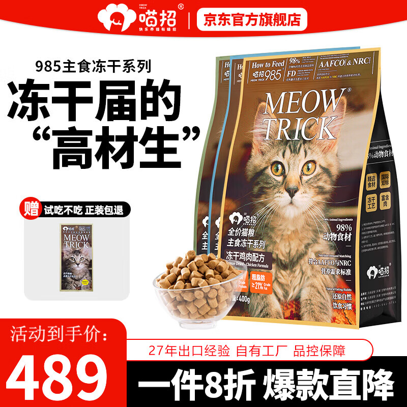 喵招985全价猫咪主食冻干幼成猫粮鸡兔鸭生骨肉美毛营养猫 冻干粮 【月餐】鸡肉配方400g*3袋