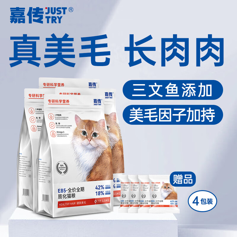 嘉传E85全价无谷美毛高蛋白猫粮(实发1.5kg*4袋 含附件及赠品)