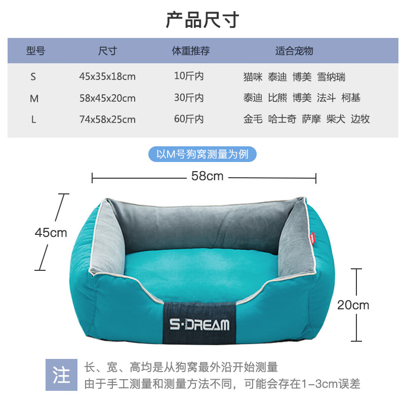 主子家 狗窝猫窝 大中小型犬泰迪狗床垫子 四季毛绒可拆洗 浅蓝色 M( 58*45*20)