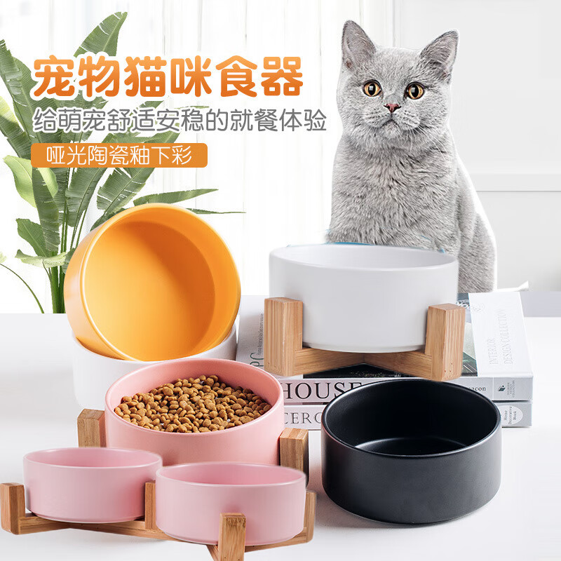 贝尼熊 猫碗高品质陶瓷双碗水碗木架保护颈椎高脚猫咪粮碗饮水碗宠物碗 黑色 L双碗带木架(碗口直径16cm)