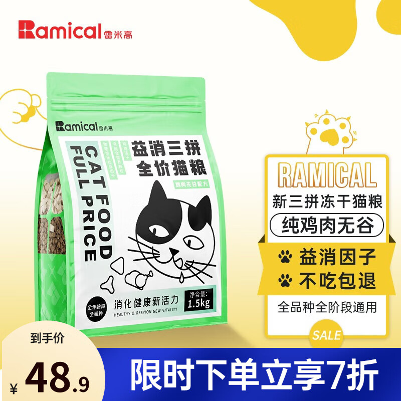 雷米高(RAMICAL)益消猫粮 成猫幼猫冻干猫粮澳宝四拼 新品丨无谷5%鸡肉冻干猫粮1.5kg