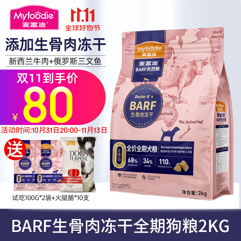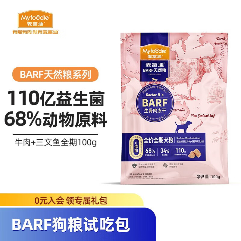 麦富迪(Myfoodie)barf冻干狗粮 生骨肉冻干双拼泰迪柯基成幼犬通用 全期犬粮2kg牛肉 三文鱼