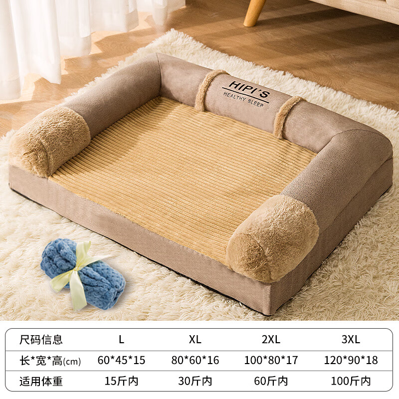 嬉皮狗狗窝四季通用秋冬保暖可拆洗大型犬金毛狗狗睡垫大狗狗垫子宠物床 卡其色三面靠(搭配毛毯) 3XL(适用100斤内)
